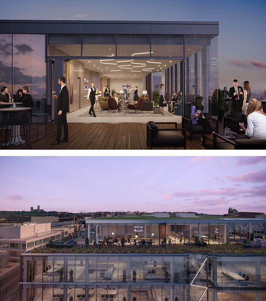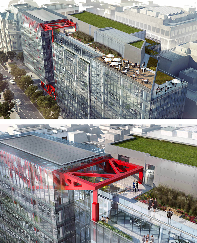 With an iconic red, structural truss and a unique, glass embellishment atop the building, 1900 N Street will be a remarkable building between Dupont Circle and the central business district in downtown Washington, DC. Hanging eight floors from above the eleventh floor, the truss provides a three-story, column-free, corner lobby below, and an engaging rooftop experience above. The glass-enclosed penthouse will offer a pantry, flexible meeting space, conference room, lounge area, and a separate warming pantry for catered, indoor/outdoor events on the sizable rooftop terrace. Learn more about 1900 N Street.