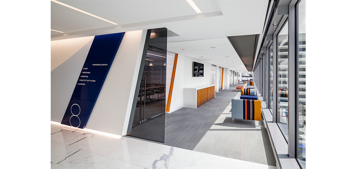 We took the client’s ‘moving forward’ brand concept and articulated it into the architecture by creating dynamic, angled volumes in the space. Three-story sweeping angles make a striking impression as you traverse the new, centralized stair that connects all three floors. Our programming connects the office with a middle floor that’s 50% amenity spaces, with café and flexible conference areas where staff can mingle and the organization can host member events and training sessions. Branded wayfinding guides visitors with a striking visual identity. We used modular glass office fronts to maximize natural light, adding windows at the end of corridors to create an open feel within a large private office population.